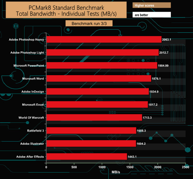 The bandwidth figures produced by the drive in PCMark 8's Standard Storage test are, quite frankly something else, with every test producing well over 1,000MB/s and in the case of the two Photoshop traces over 2,000MB/s.