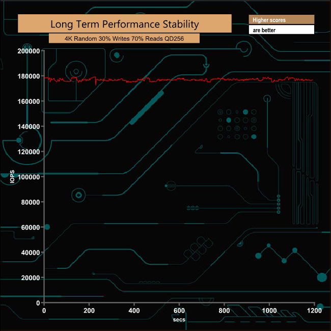 For the long term performance stability test, we set the drive up to run a 20-minute 4K random test with a 30% write, 70% read split, at a Queue Depth of 256 over the entire disk. The 480GB Intel Optane SSD 905P averaged 179,587 IOPS for the test with an excellent enterprise-class performance stability of 98.51%.