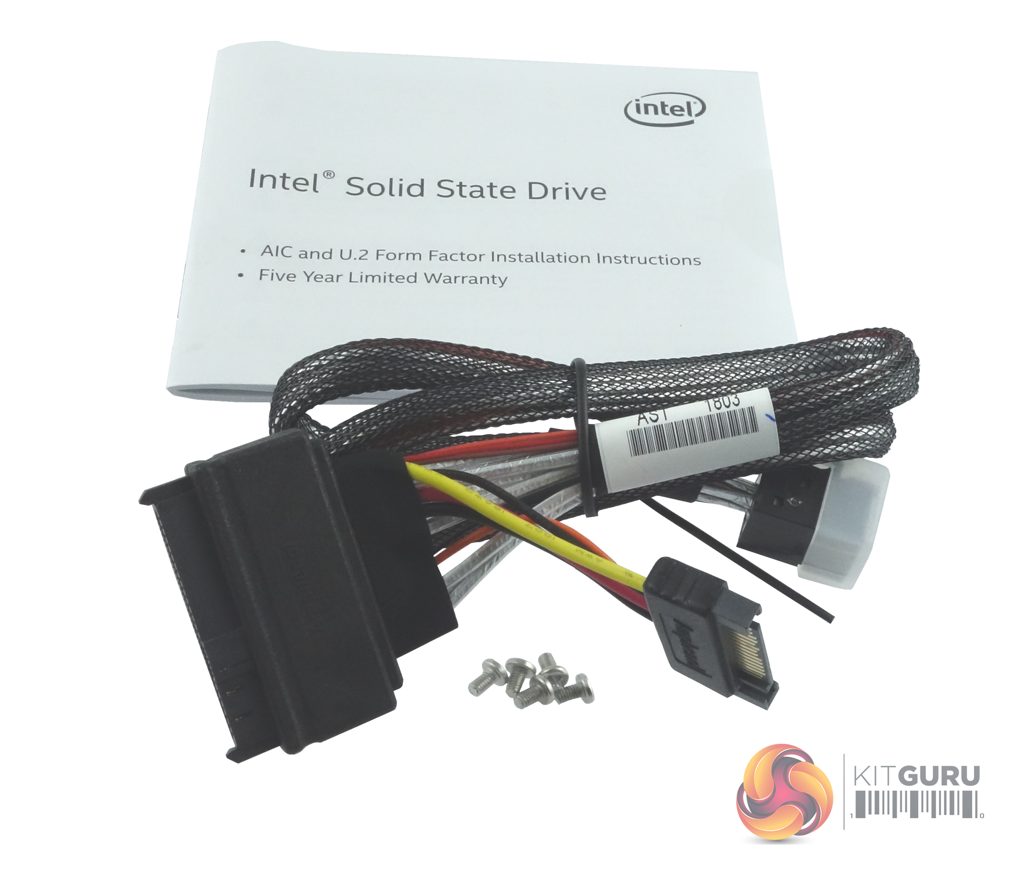 Bundled in with the drive is a SFF-8639 data / power combo cable which is handy, but you'll still need to get a M.2 To U.2 Mini-SAS adapter to connect the drive to a motherboard. There's also a set of fixing screws and a warranty manual.