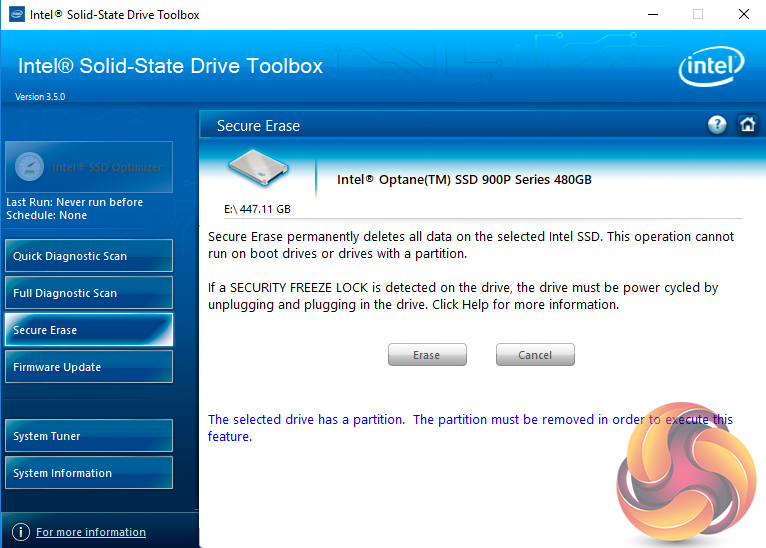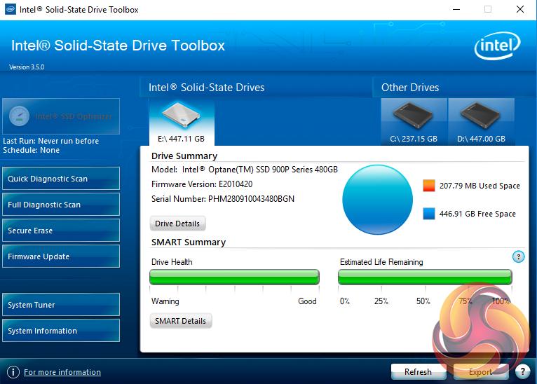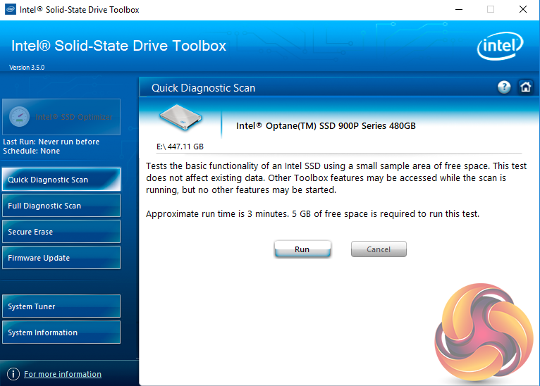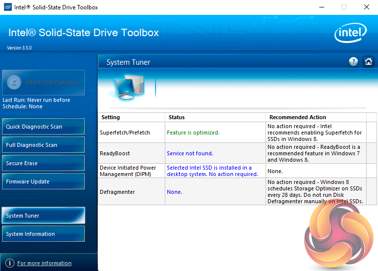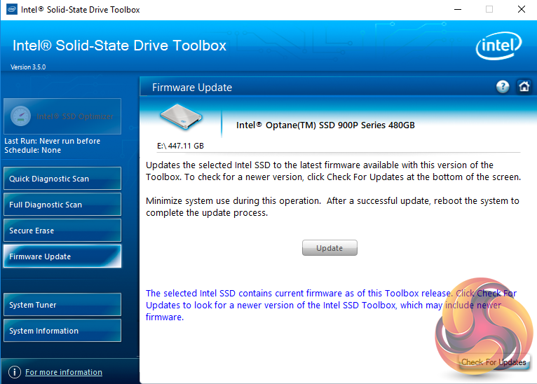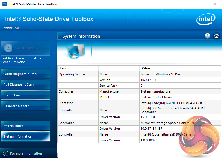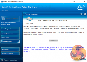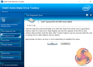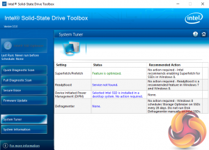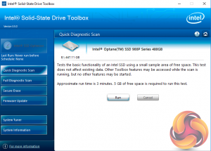 There are seven buttons on the right hand side of the utility main screen. These are for Intel’s SSD Optimiser, two drive diagnostic scans, one quick / the other full, secure erase, firmware updates, a system tuner and a page for system information.