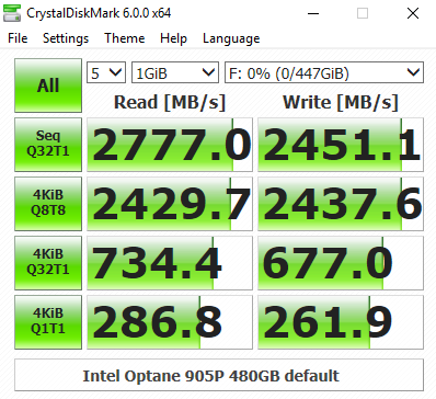 Intel's 3D XPoint memory is all about very high random performance at low queue depths, particularly read's, something perfectly illustrated by the two sets of CrystalDiskMark results. At a QD of 32 the drive sits behind the Plextor M9Pe(Y), the Corsair Force MP510 and Samsung's SSD970 PRO.