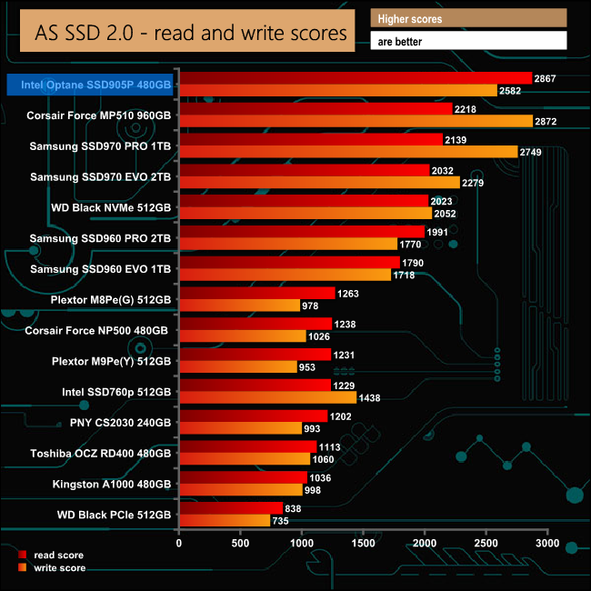 The Intel Optane SSD 905P goes straight to the top of the list of tested drives in the AS SSD benchmark with a read score of 2867, which is the fastest we have seen to date for a 480GB drive. The write score isn't quite as strong, being the third highest score behind the Corsair MP510 and Samsung's SSD970 PRO.