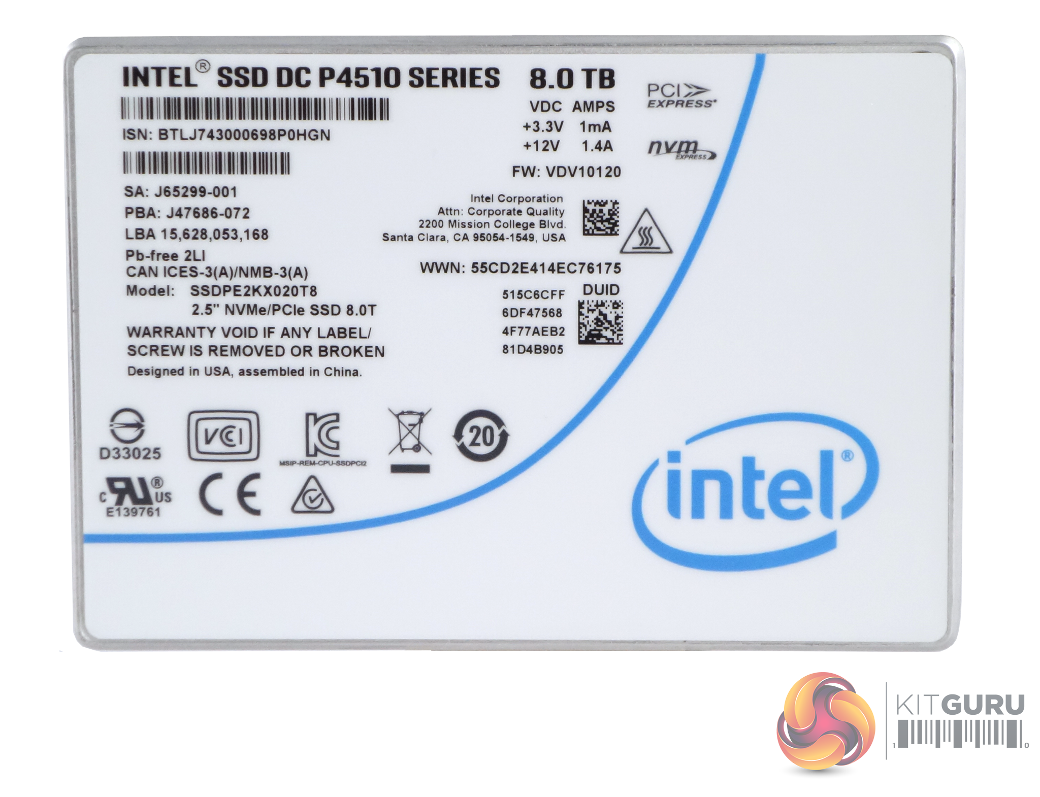 We didn't open up the P4510 to look at the internal layout, but what we do know is that it uses two PCBs joined together with a data ribbon. One carries the Intel controller along with the DRAM cache chips, a large capacitor for the power loss protection and some of the NAND packages. The second PCB carries all of the remaining 64-layer Intel 3D TLC NAND packages that make up the drives capacity.