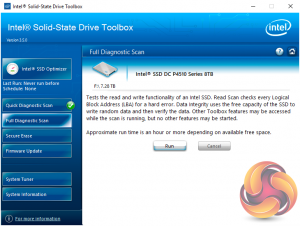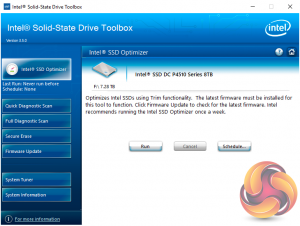 There are seven buttons on the right hand side of the utility main screen. These are for Intel’s SSD Optimizer, two drive diagnostic scans, one quick the other full, secure erase, firmware updates, a system tuner and a page for system information.