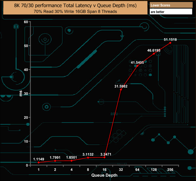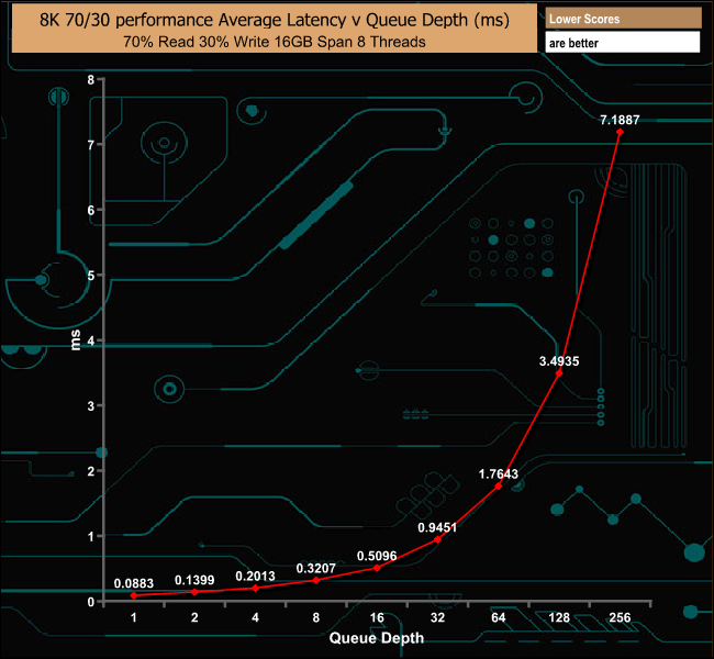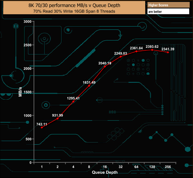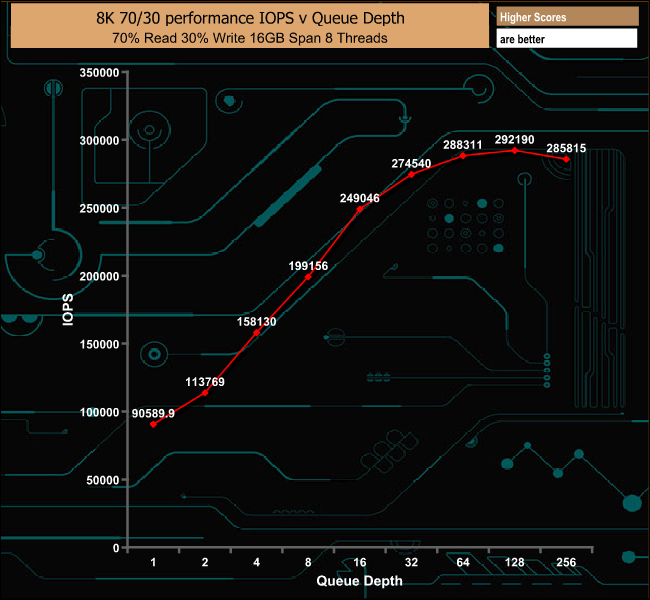 Testing the drive with a 8KB data block and a 70/30 read/write split, again another test with the enterprise environment in mind saw the drive produce a peak of 292,190 IOPS, strong performance for this particular test.