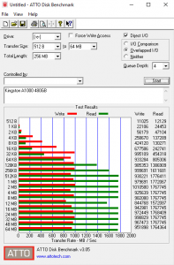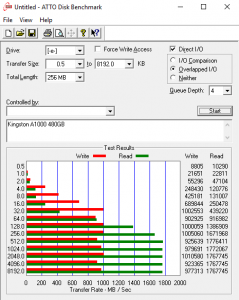 The official sequential read/write figures for the 480GB A1000 are up to 1,500MB/s and 900MB/s, numbers we could confirm and indeed even better with the ATTO benchmark. Our review drive produced a read performance of 1,767MB/s with writes coming in at 1,010MB/s.