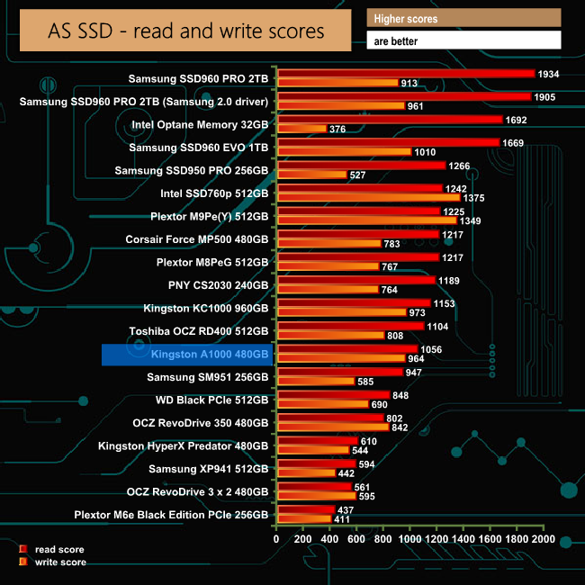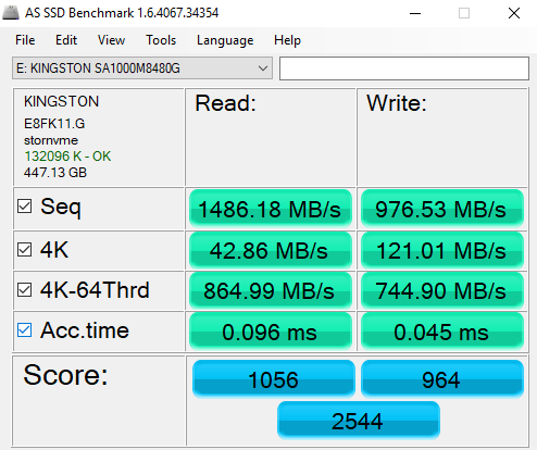 For an entry level NVMe drive, the Kingston A1000 performs reasonably well in the more stringent AS-SSD test.
