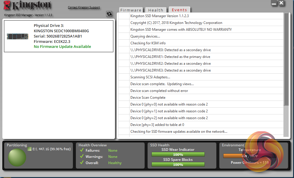 Kingston’s SSD management software utility is simply called SSD Manager. With it, you can monitor the health of the drive and how it’s being used, check the drive’s SMART data (including reliability tracking, usage statistics, life remaining, wear levelling and temperature) and update the firmware.