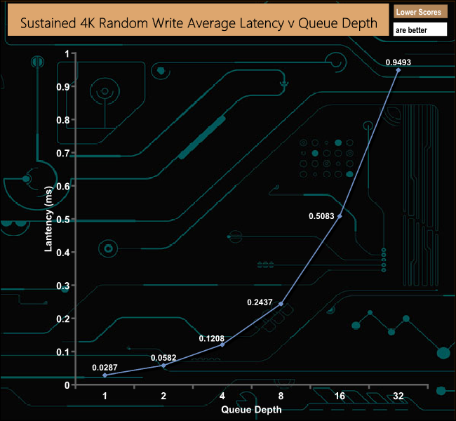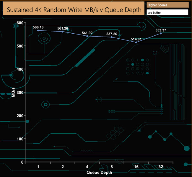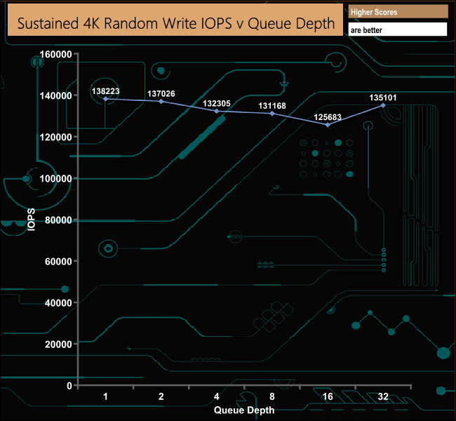 Kingston quote a Steady State 4K random write figure of up to 20,000 IOPS for the drive. When tested fresh out of the box, we got a peak figure of 138,223 IOPS at a QD of 1 with our four-threaded tests.