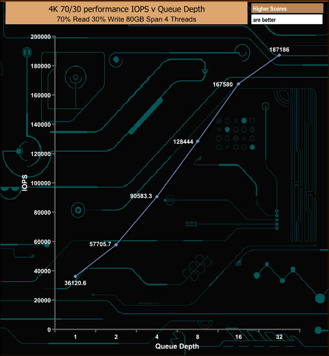 The drive performs very well in our 4K 70/30 read/write test, with the performance climbing steadily and smoothly through the tested queue depths.