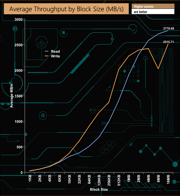 In our throughput tests the peak read performance at 2,778,59MB/s doesn't quite get to the maximum official figure of 3,100MB/s. The write throughput peak falls short as well but this time is much closer to the official 2,600MB/s at 2,515.71MB/s.