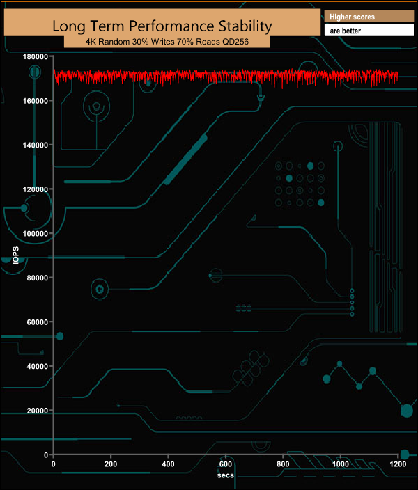 For the long term performance stability test, we set the drive up to run a 20-minute 4K random test with a 30% write, 70% read split, at a Queue Depth of 256 over the entire disk. The DC1000M averaged 171,579 IOPS for the test with a performance stability of 98% which is what you should expect from a drive aimed at the data centre market segment.