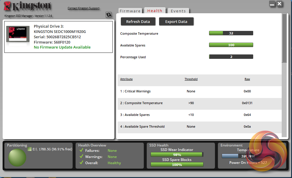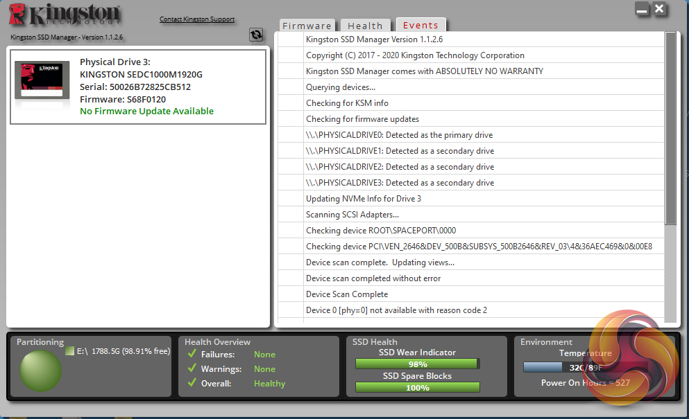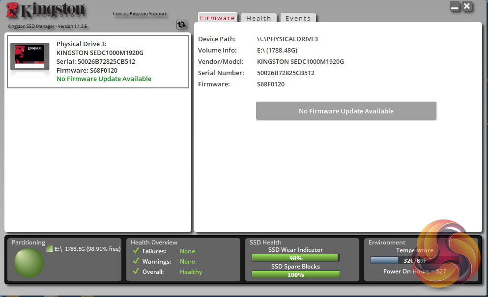 Kingston’s SSD management software utility is simply called SSD Manager. With it, you can monitor the health of the drive and how it’s being used, check the drive’s SMART data (including reliability tracking, usage statistics, life remaining, wear levelling and temperature) and update the firmware.