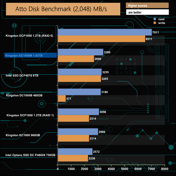 The 1.92TB DC1000M is rated up to 3,100MB/s for Sequential reads and up to 2,600MB/s for writes. Using the ATTO benchmark we could confirm both those figures with the tested drive producing a read figure of 3,380MB/s, some 280MB/s over the official speed with writes at 2,690MB/s.