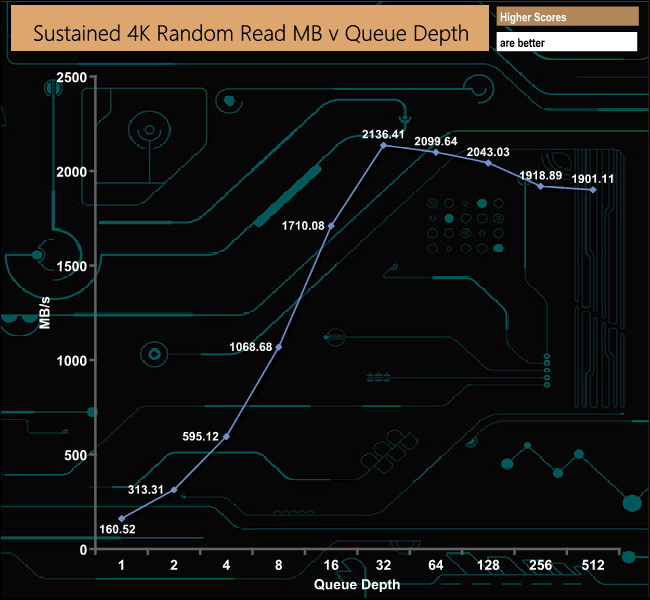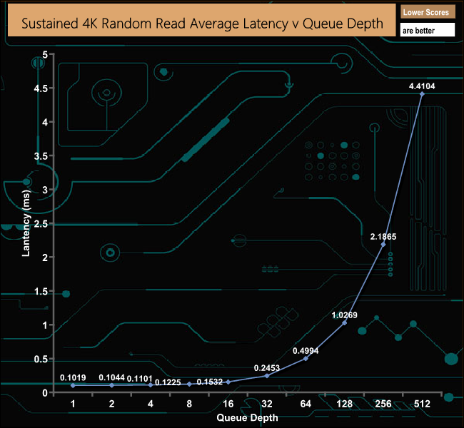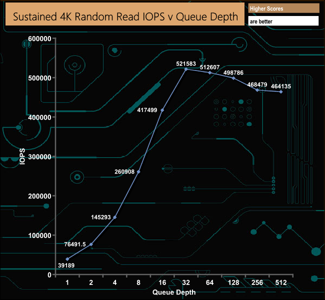Kingston rate the DC1000M's 4K random read performance as up to 540,000 IOPS. When tested with our four threaded tests, the best result we saw was 521,583 IOPS at a queue depth of 32. After peaking at QD32 the performance slowly drops away, to finish the test runs at 464,135 IOPS at a queue depth of 512. We did a quick test at QD32 but with 8 threads and saw a peak maximum figure of 611.539 IOPS.