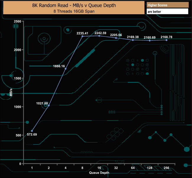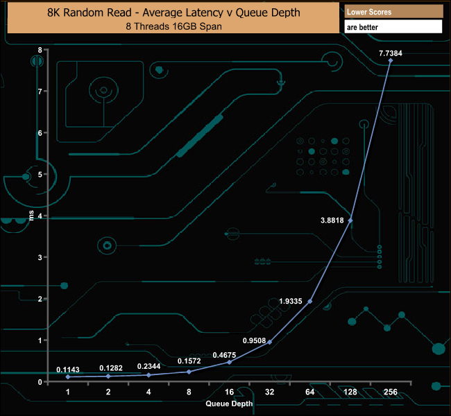 As the DC1000M has been designed for use in data centres we also tested the drive using 8K data. In our read test, the drive topped out at 273,754 IOPS (QD16) before slowly dropping back to finish the test run at 264,744 IOPS at QD256.