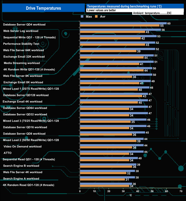 We took note of the drive’s temperature during some of our benchmarking runs. The DC1500M average peak temperature from the 26 runs we measured was 47° C (23° C ambient) with the highest temperatures coming during the Database Server QD4 workload test run at 60° C.