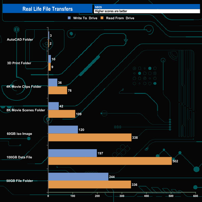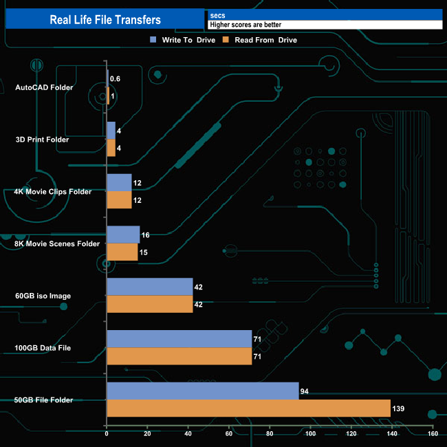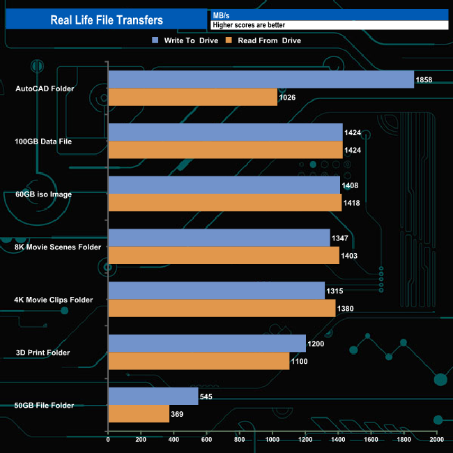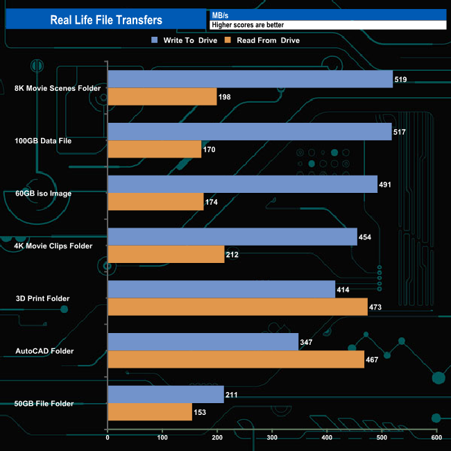 In our seven real-life file transfer tests, the DC1500M averaged 422MB/s when writing (the fastest being the 519MB/s for the 8K Movie Scene folder) and 264MB/s when reading the data back, the fastest performance coming from the 3D Print Folder transfer.