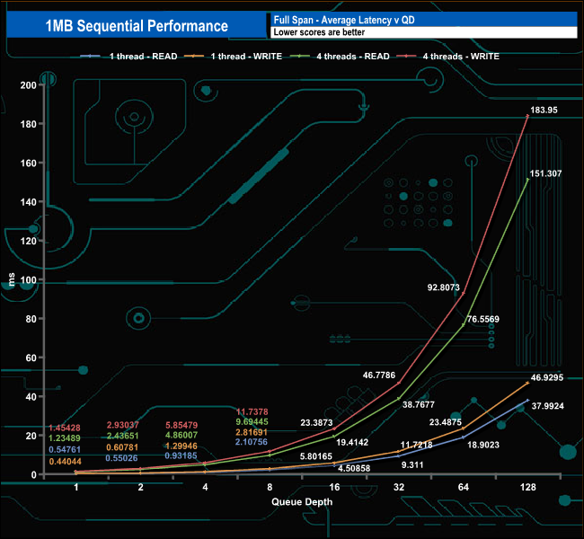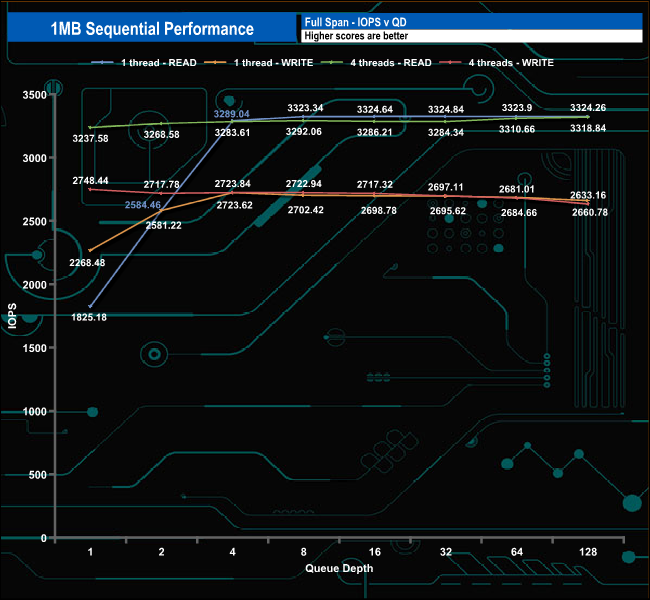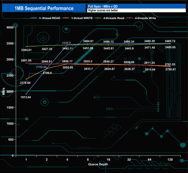 We could confirm and indeed better both the official Sequential figures of up to 3,100MB/s and up to 2,700MB/s for read and writes respectively with our own tests. The drive produced peak read test results of 3,485MB/s using 4-threads and 3,480MB/s for a single thread. Sequential write performance peaked at 2,855MB/s (QD4) using a single thread and 2,881MB/s (QD1) using four threads, both confirming the official figures. From QD4 both reads and writes showed pretty consistent performance.
