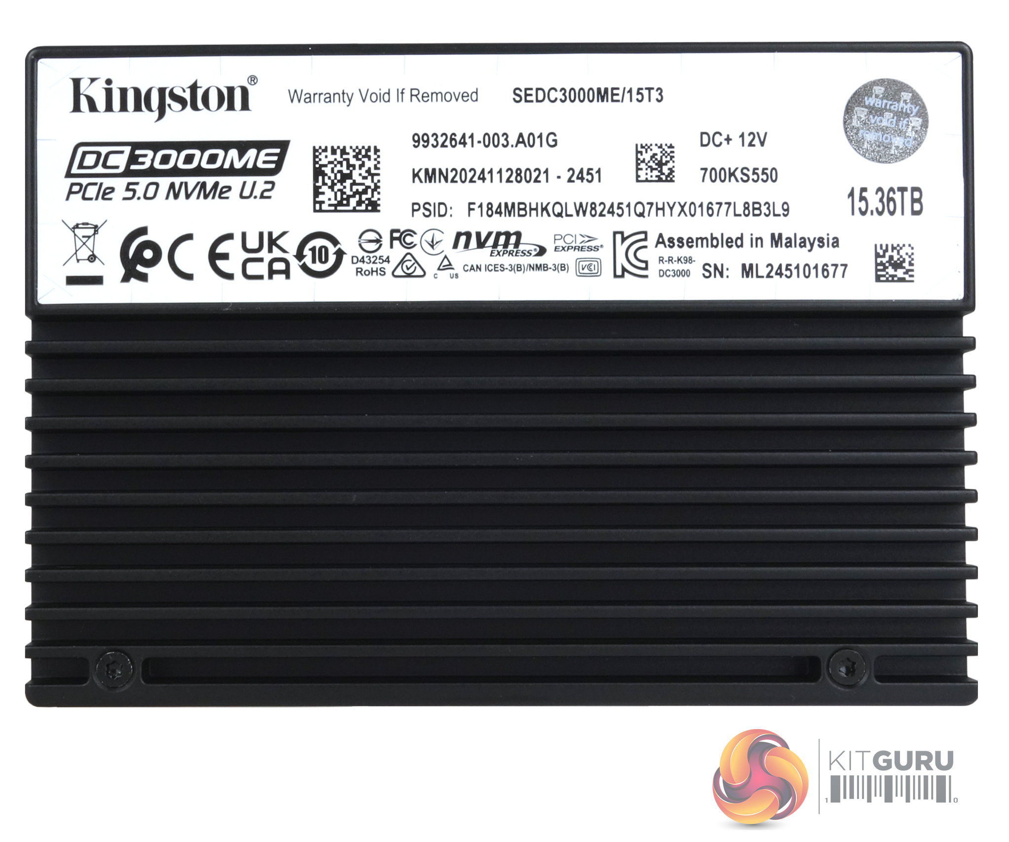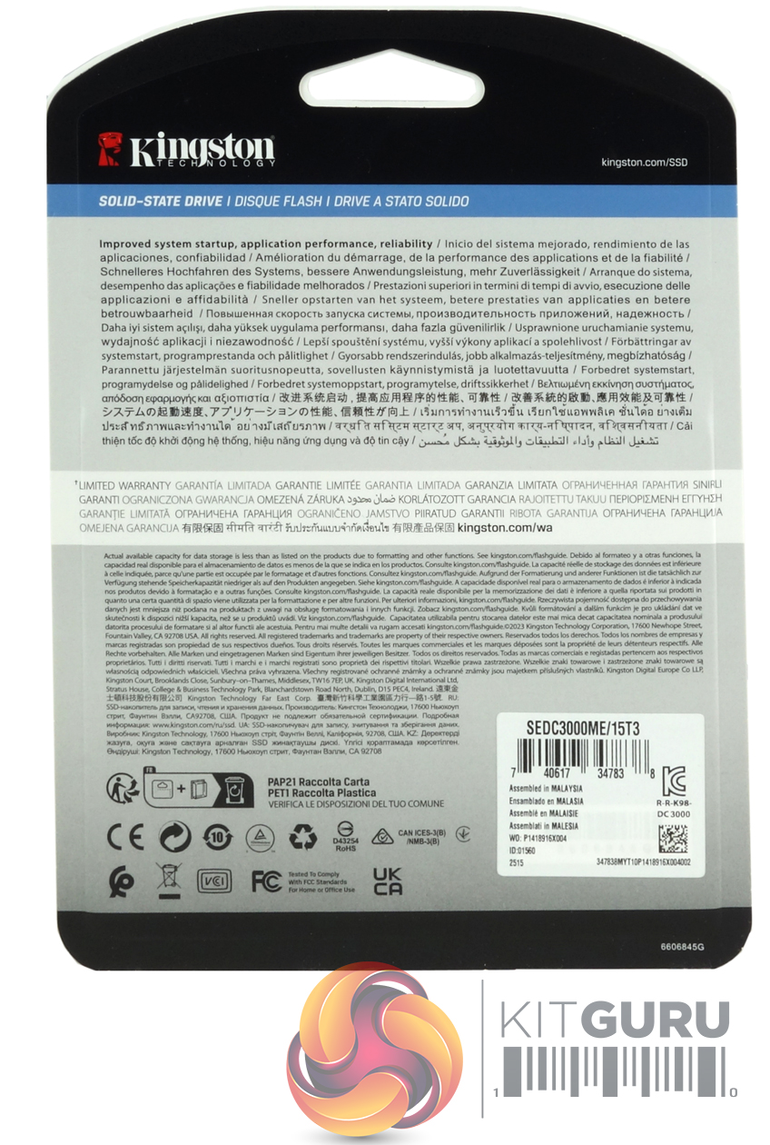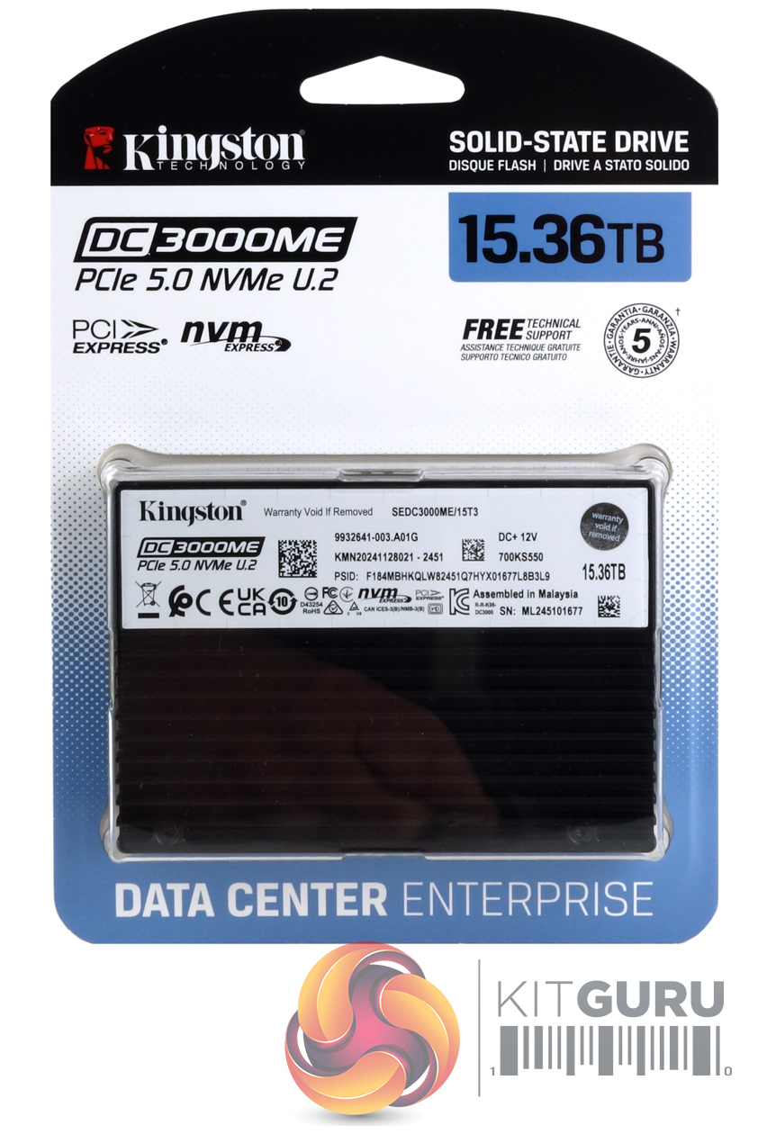 Many companies deliver their data centre/enterprise drives in plain vanilla boxes, not so Kingston, they ship theirs in blister packs just like their retail consumer drives. The DC3000ME’s blister pack has the drive’s capacity clearly labelled on the front, along with interface type and which market segment(s) the drive is aimed at, together with a logo that displays the 5-year warranty that Kingston backs the drive with. The rear of the packaging has multilingual marketing and warranty notes on it.