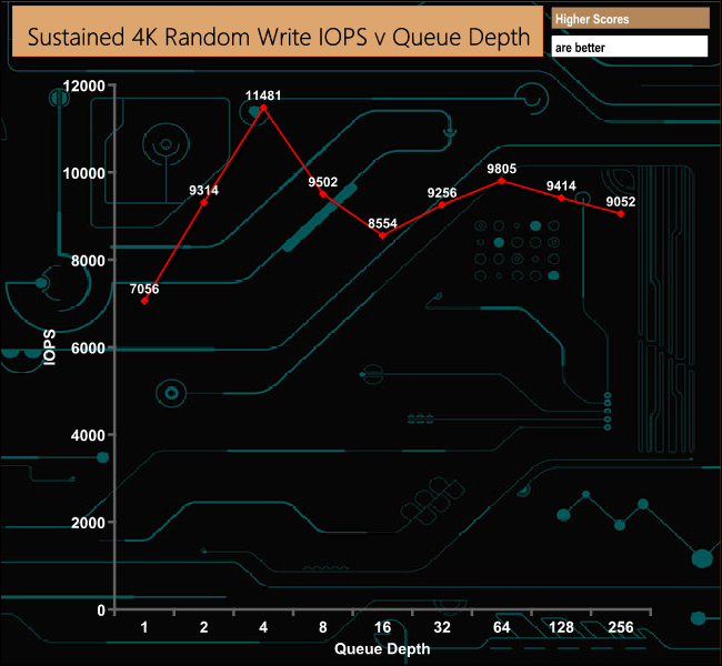 Kingston quote a random write figure of 11,000 IOPS when the drive is in a steady state. Under test conditions, the drive reached this figure at a queue depth of 4 but struggled to reach that level at higher and indeed lower queue depths.