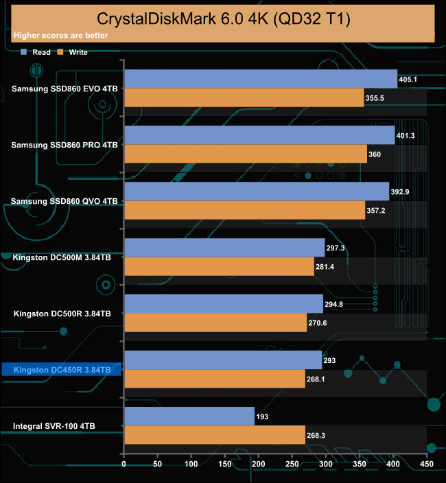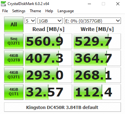 There isn't much to split between any of the three Kingston data centre drives (DC500M, DC500R and DC450R) that we've tested when looking at the 4K QD32 T1 test of the CrystalDiskMark benchmark. Comparing the two benchmark result screens it appears that the Phison PS3112-S12DC seems to prefer compressible data when reading 4K data at a QD of 1.