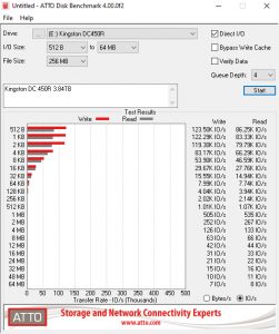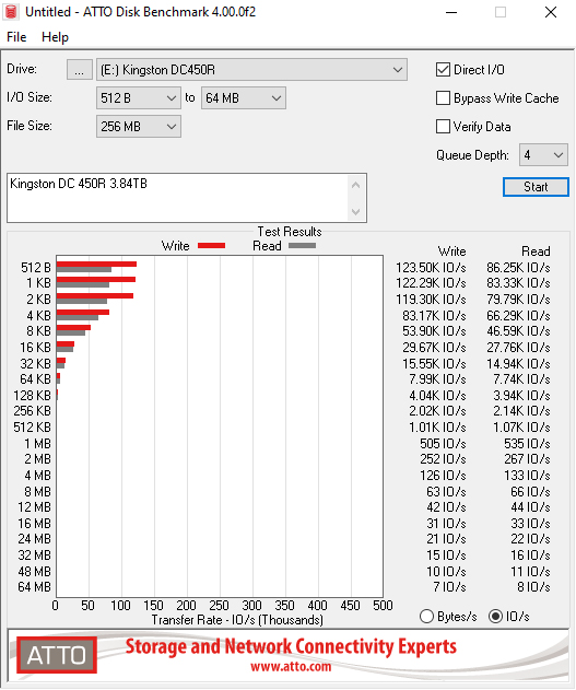 Officially the Sequential read/write performance for the 3.84TB DC450R is up to 560MB/s and 525MB/s respectively. Using the ATTO benchmark we couldn't quite hit those maximums with the review drive producing read/write figure of 535MB/s and 505MB/s respectively.