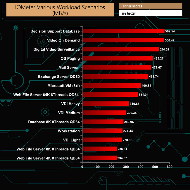 Overall the DC500R performs well when dealing with these scenarios with the best performance being the 562MB/s result for the Decision Support DB test run.