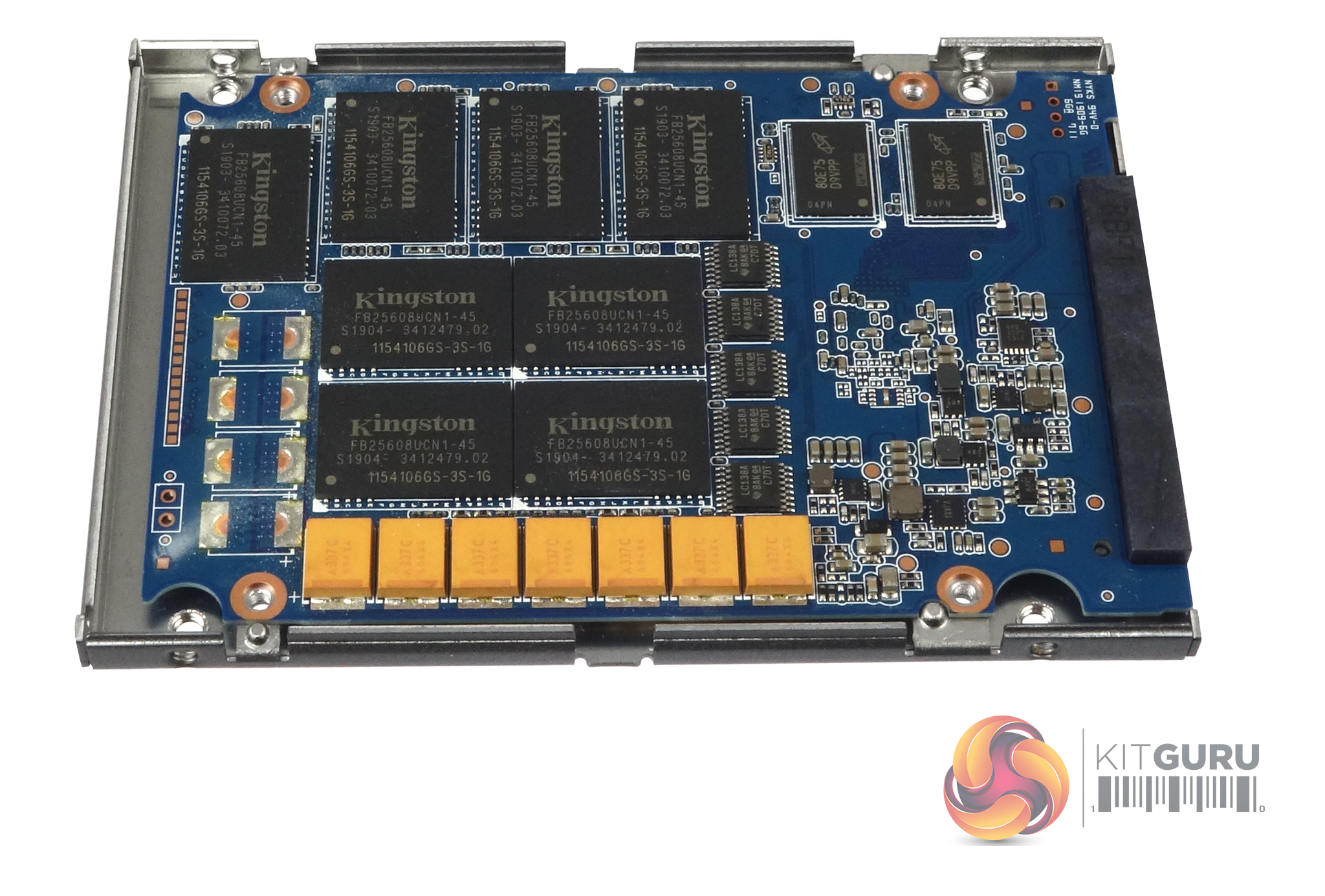 On one side of the PCB sit eight 256GB packages of Kingston branded Intel 64-layer 3D TLC NAND along with a pair of Micron DDR4-2666 DRAM chips. Also on side of the PCB are a row of tantalum capacitors for power loss protection. The other side of the board has yet more tantalum caps, eight further NAND packages, a couple more cache IC's and the Phison PS3112-S12DC controller.