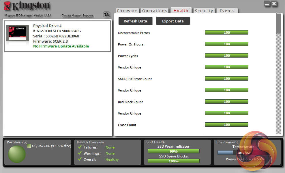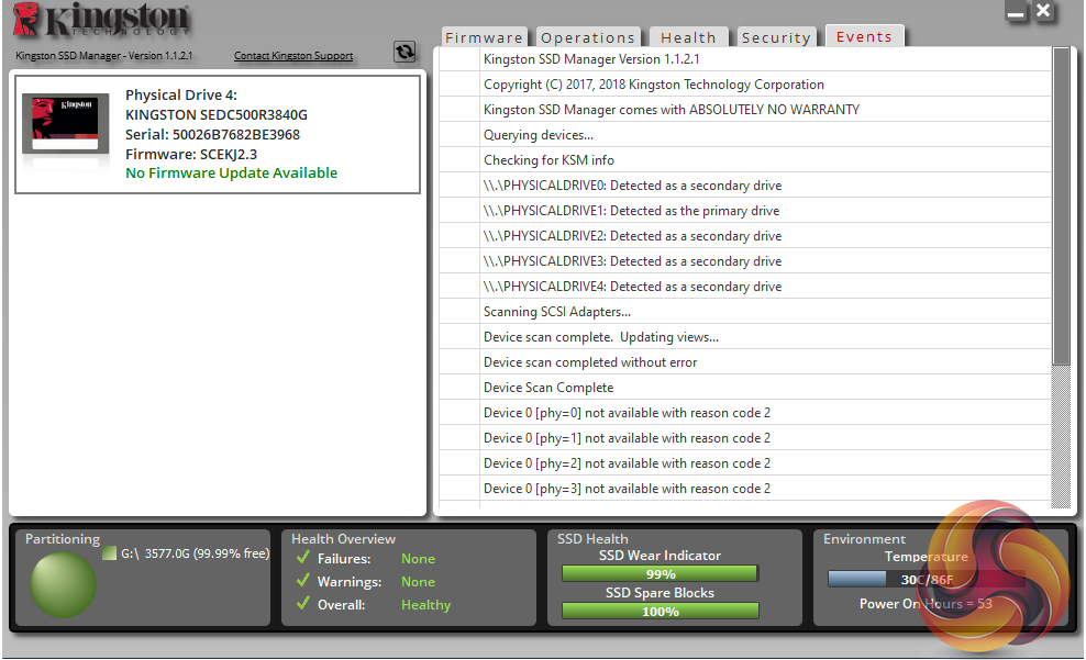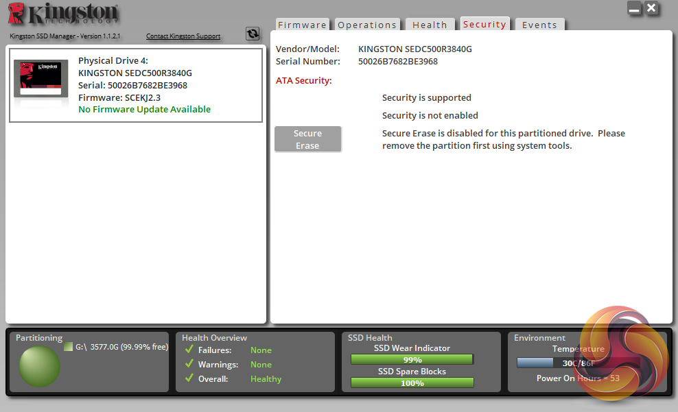Kingston’s SSD management software utility is simply called SSD Manager. With it, you can monitor the health of the drive and how it’s being used, check the drive’s SMART data and update the firmware as well as securely erasing the drive. You can also adjust and manage the over-provisioning of the drive