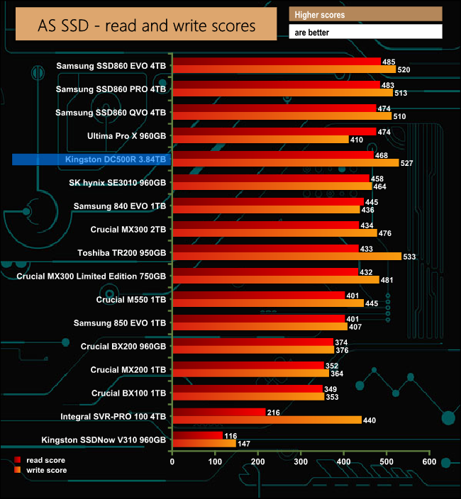 The ASSSD read score of 468 for the DC500R is enough to put the drive into fifth place in our results chart, but more impressive especially for a read-centric drive is the write score of 527, the second-fastest score we have seen for this group of SATA SSDs.