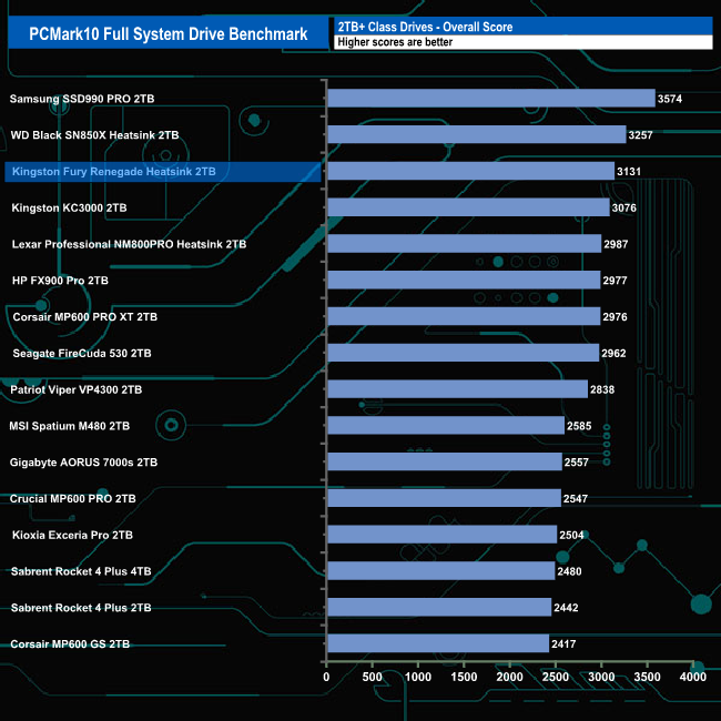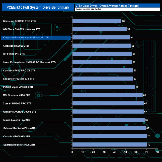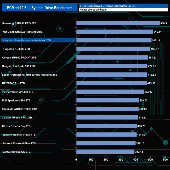 The Kingston Fury Renegade Heatsink handled the rigours of the PCMark 10's Full System Drive Benchmark without any problems. It averaged 217MB/s for the six Adobe start-up test traces, with the Acrobat setup trace fastest at 281MB/s. The average for the five usage traces was 474MB/s, thanks mainly to the 1,086MB/s result for the Adobe Photoshop heavy usage trace.