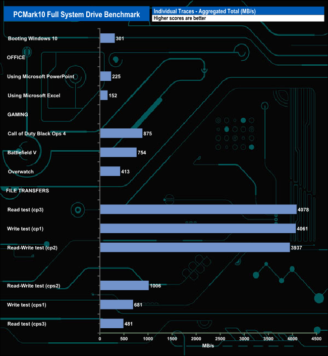 The PCMark 10 Full System Drive Benchmark uses a wide-ranging set of real-world traces from popular applications and common tasks to fully test the performance of the fastest modern drives. The benchmark is designed to measure the performance of fast system drives using the SATA bus at the low end and devices connected via PCI Express at the high end.