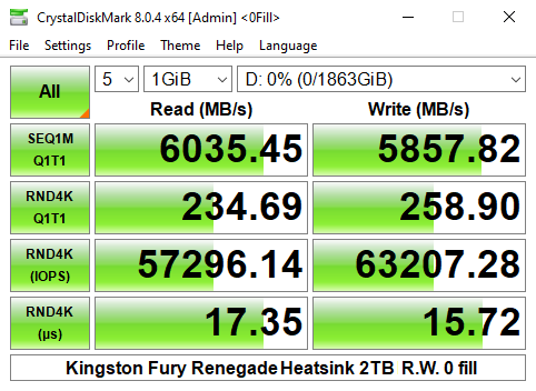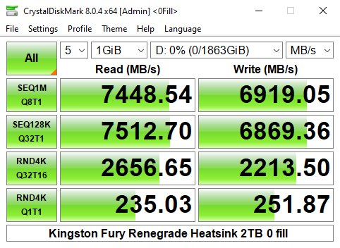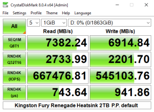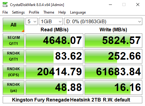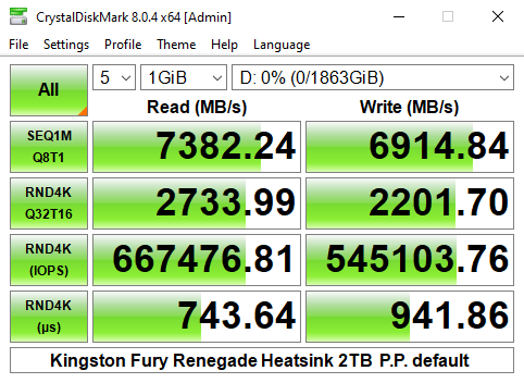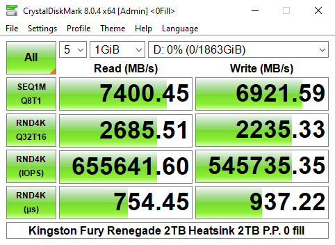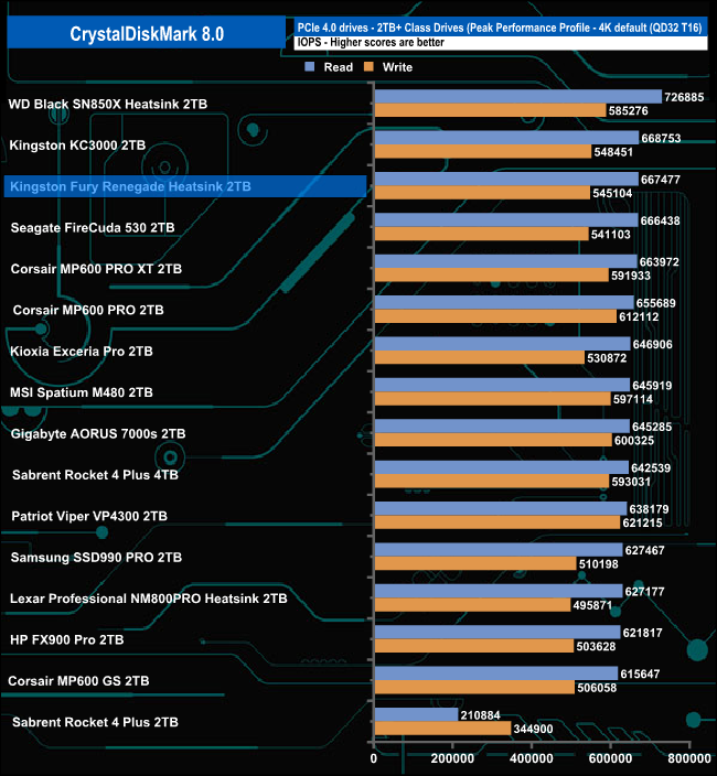 Officially the 4K read/write performance of the 2TB version of the Fury Renegade is rated as up to 1,000,000 IOPS for both. As you can see from the benchmark result screens of CrystalDiskMark 8's Performance Profile test we couldn't get close to that figure with best result figures of 667,476 IOPS and 545,103 IOPS for reads and writes respectively.