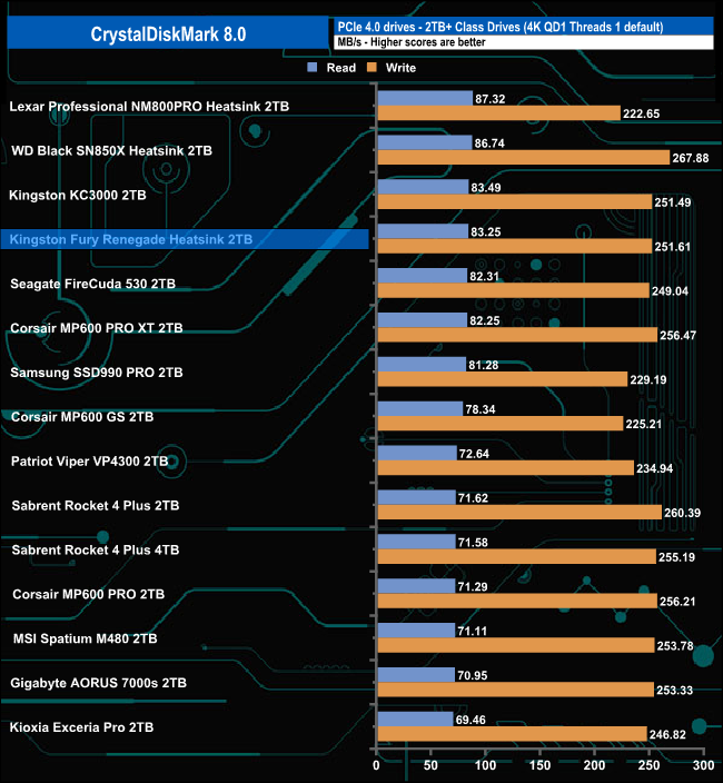 Using the CrystalDiskMark 8 4K QD1 single thread test, the drive scores of 83.25MB/s (reads) and 251.61MB/s (writes) are good enough to put the drive into the top five in our results chart.