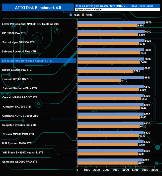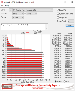 Using the ATTO benchmark we couldn't quite hit the official maximum Sequential read/write figures of 7,300MB/s and 7,000MB/s respectively with test results of 6,880MB/s for reads and 6,470MB/s for writes.