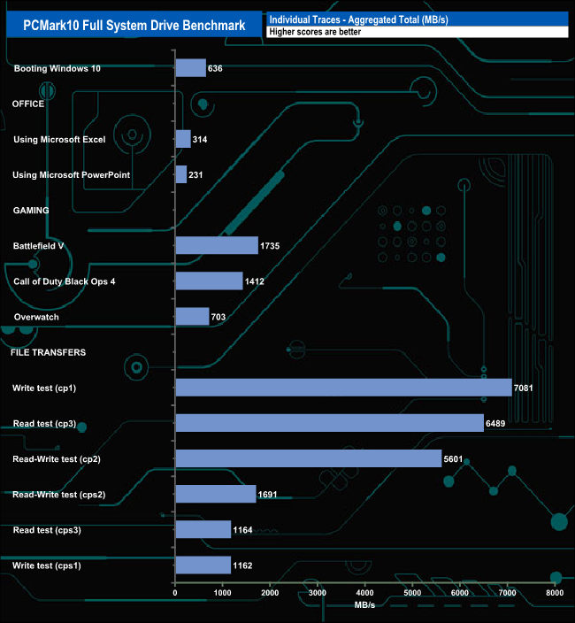 The PCMark 10 Full System Drive Benchmark uses a wide-ranging set of real-world traces from popular applications and common tasks to fully test the performance of the fastest modern drives. The benchmark is designed to measure performance of fast system drives using the SATA bus at the low end and devices connected via PCI Express at the high end.