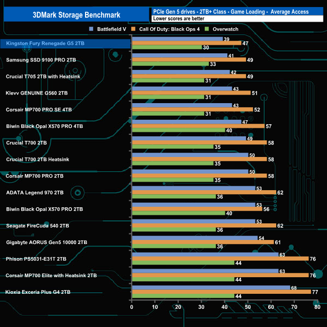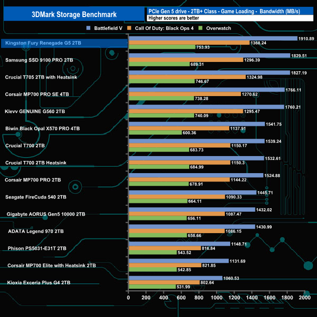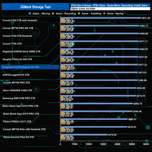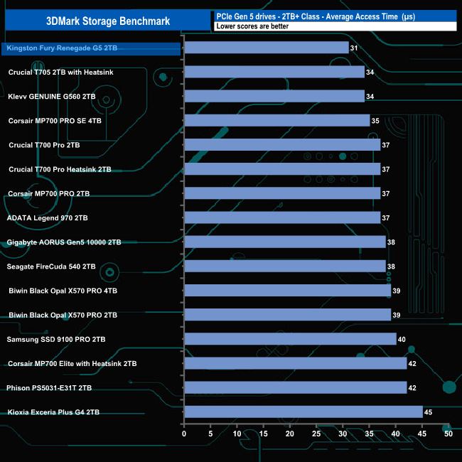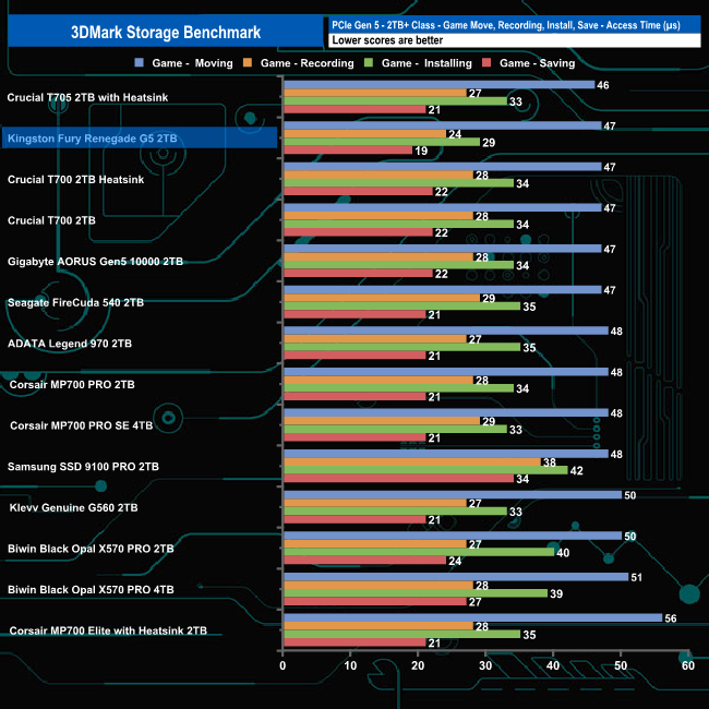 In 3DMark’s Storage Test, the Fury Renegade G5 had an average game loading bandwidth figure for the three games of 1,344.35MB/s, the fastest we've seen to date in this part of the test with an average access time figure of 38µs (0.038m/s), also the fastest figure we've seen to date for the game loading test traces.