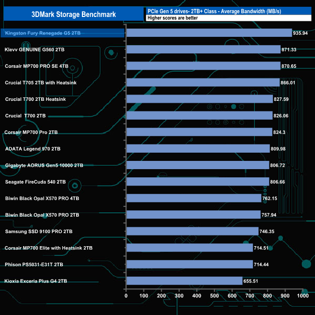 The overall average bandwidth figure for the 2TB Kingston Fury Renegade for the complete benchmark run was 934.94MB/s (31µs total average access time), a result which sees the drive topping the table by some margin.