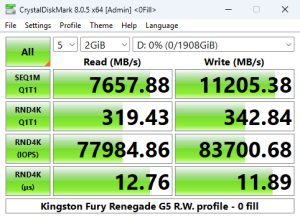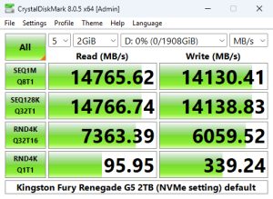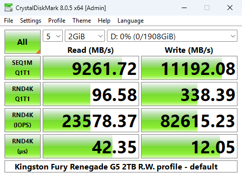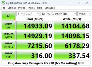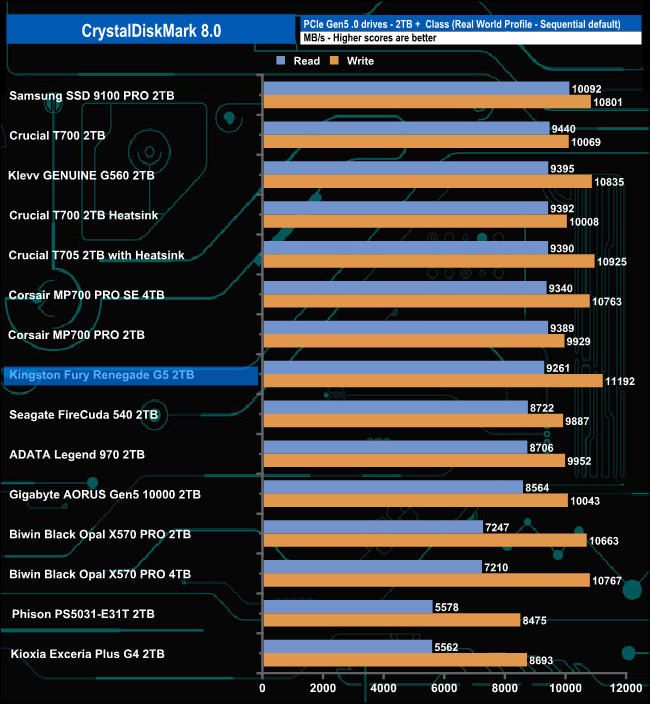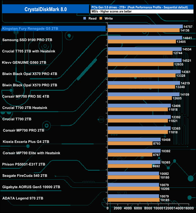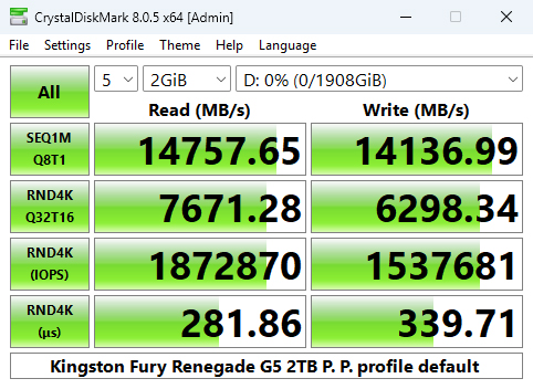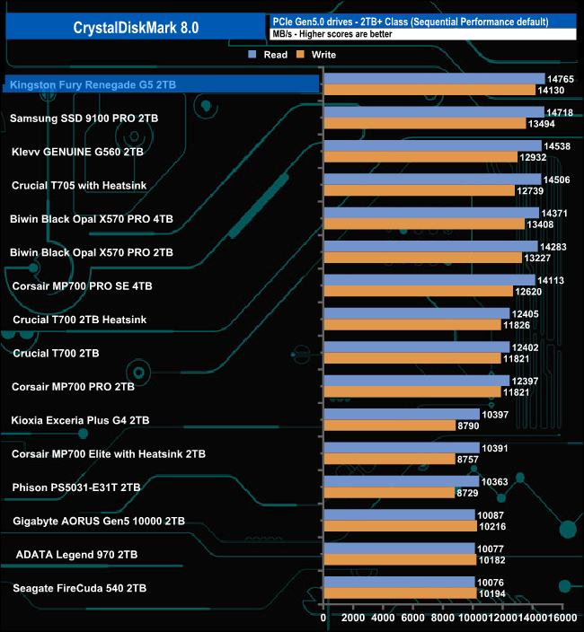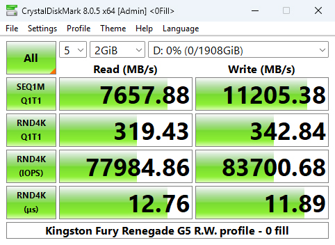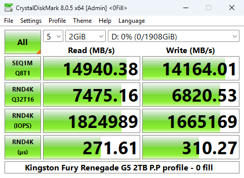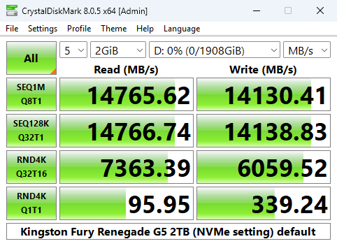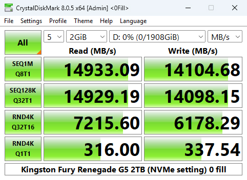 That 14,765MB/s read result places the 2TB Fury Renegade G5 in first place on the results chart, the write test is also the fastest we've seen to date in this test.