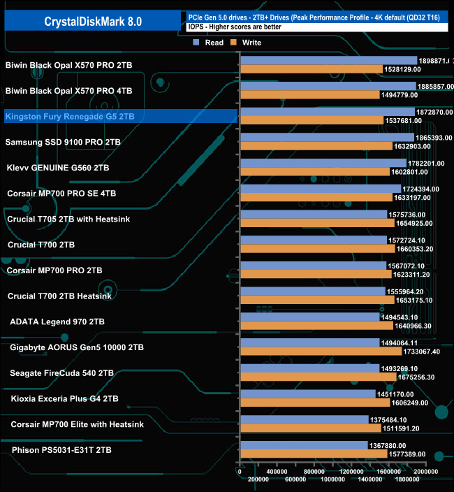 The 2TB Fury Renegade G5 is officially rated as up to 2,200K IOPS for random reads and random writes. Using the Peak Performance profile test of CrystalDiskMark 8, we couldn't get to those official maximums. The best read result we saw was 1,872,870 IOPS with the best write figure at 1,537,681 IOPS, which sees the drive in third spot on the result graph.