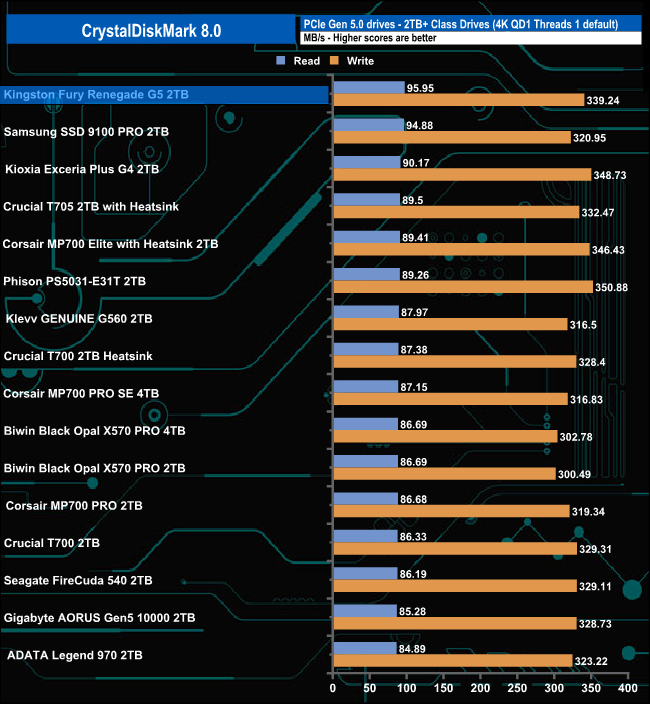 With a read result of 95.95MB/s in the CrystalDiskMark 8 4K QD1 T1 test, Kingston's Fury Renegade G5 is in first place on the results chart. Its write score of 339.24MB/s is the fourth fastest we've seen in this test.