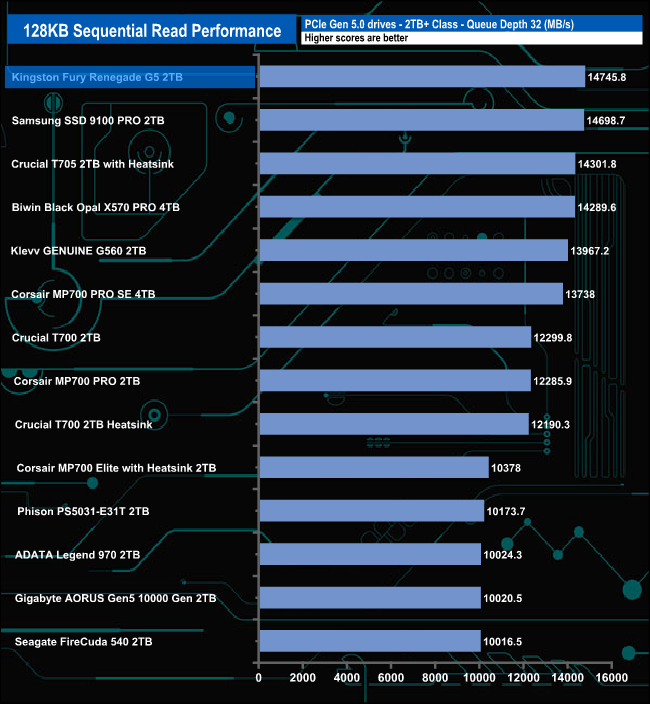 Using this Sequential test, the results confirmed the official Sequential ratings of the drive of up to 14,700MB/s and 14,000MB/s for read and write, respectively, with figures of 14,745MB/s for reads (QD32) and 14,133MB/s (QD16) for writes.
