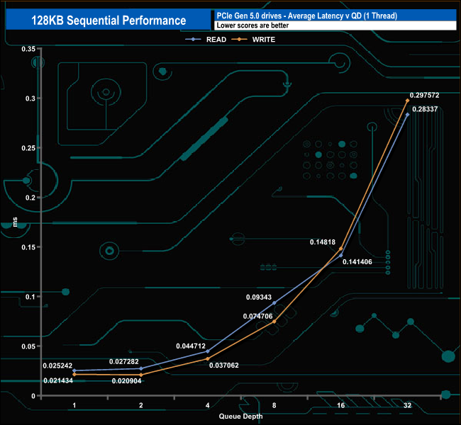 When it comes to the Sequential writes, the drive is very consistent, sitting in the top spot of the results chart across all the tested queue depths.