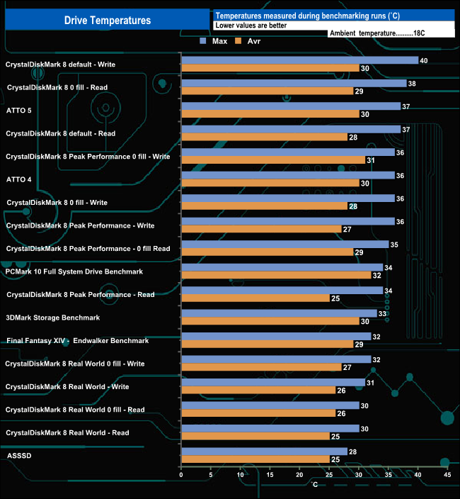 The drive has a few design features to combat the Achilles heel of high-end Gen5 drives, which is heat generation. Chief amongst these is the Silicon Motion SM2508 controller, which uses a TSMC 6nm process rather than the 12nm process used by previous-generation controllers, enabling better thermal management. It works well enough, as the hottest the drive got while benchmarking was 40° C during a CrystalDiskMark 8 default Write test run. For the bulk of our testing, the drive averaged 35° C, with the 4K-focused tests averaging 30° C, both well below the drive's 70° C maximum operating temperature.