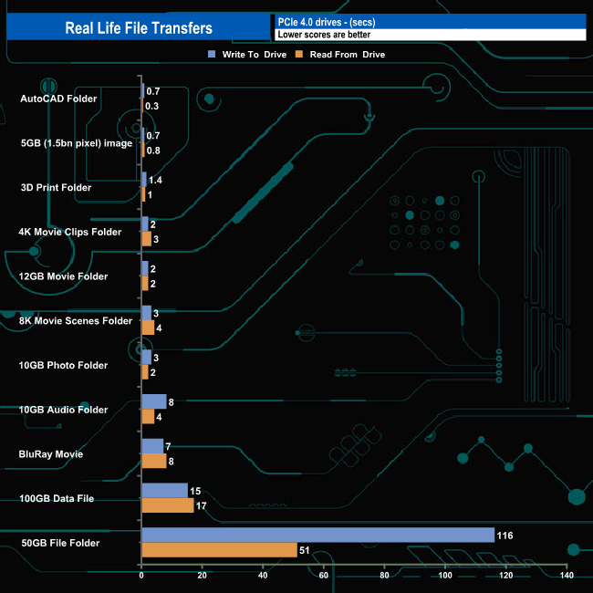 To test real-life performance of a drive, we use a mix of folder/file types, and by using the FastCopy utility (which gives a time as well as MB/s result), we record the performance of the drive reading from & writing to a 2TB Kingston KC3000.