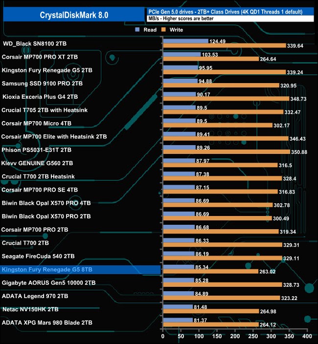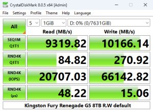 Using the CrystalDiskMark 8 4K QD1 T1 test, the 8TB version of the Fury Renegade G5 produces a read result of 85.34MB/s, 10MB/s slower than the 2TB version. The write result of 263MB/s is also slower.