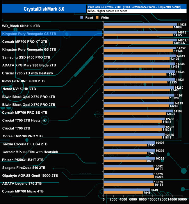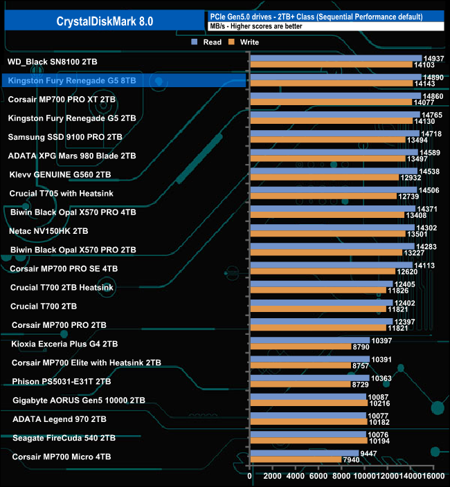 That 14,890MB/s read result places the 8TB Fury Renegade G5 into second place on the results chart, 125MB/s faster than the 2TB model, while its write score of 14,143MB/s is just 13MB/s faster.
