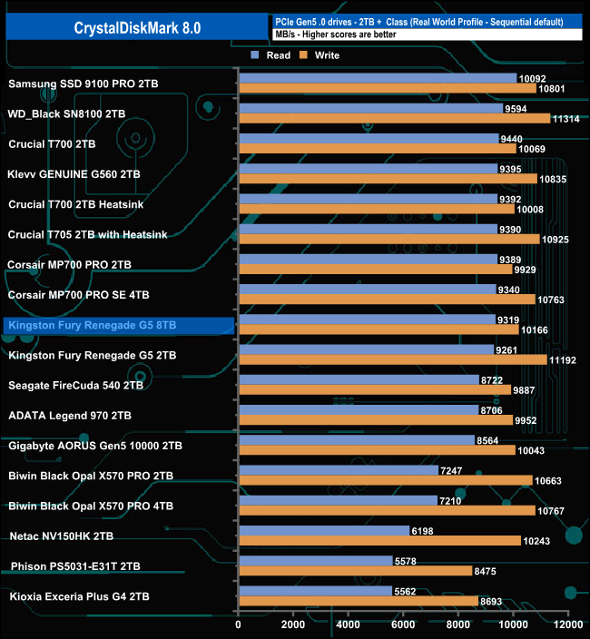 The 8TB Kingston Fury Renegade G5‘s read score in the CrystalDiskMark 8 Real World benchmark sees the drive in a mid-table position, slightly faster than the 2TB version. Its write test result of 10,166MB/s is 1,0256MB/s slower than the 2TB model.