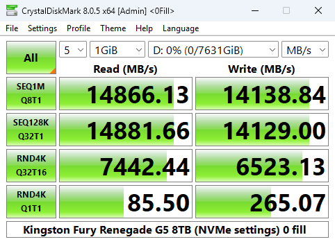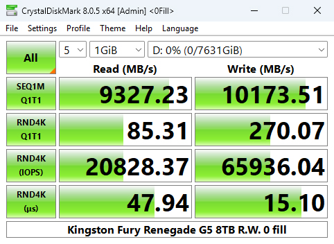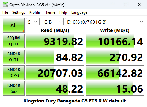 Using the CrystalDiskMark 8 4K QD1 T1 test, the 8TB version of the Fury Renegade G5 produces a read result of 85.34MB/s, 10MB/s slower than the 2TB version. The write result of 263MB/s is also slower.